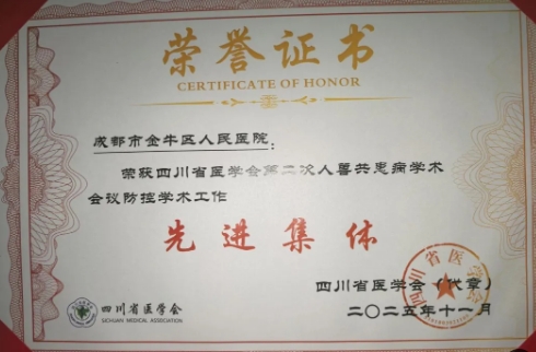近日,四川省医学会第二次人兽共患病学术会议在成都市金河宾馆圆满落幕。本次会议聚焦人兽共患病防控策略与学术前沿,汇聚全省相关领域专家学者交流研讨。会上,医院凭借在防控学术工作中的扎实表现与积极贡献,荣获“防控学术工作先进集体”称号。