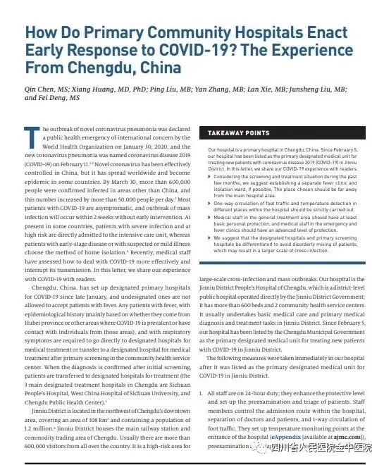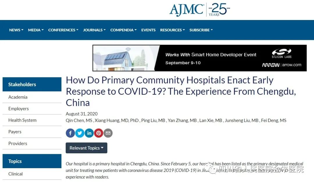 近日,美国医疗管理杂志(American Journal of managed Care,AJMC)(IF:1.5)发表由我院肾脏内科陈琴医师第一作者,邓菲主任为通讯作者,题为《基层医院如何应对新冠肺炎?来自中国成都的经验》的论文,并在其官网上正式刊登供读者参考学习。