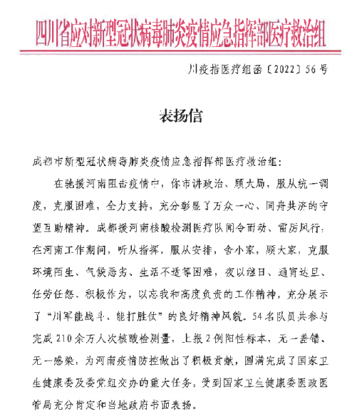 近日,四川省新冠疫情应急指挥部医疗救治组对我院踊跃参与援豫的六位检验科医务人员发来表扬信,对他们在河南抗疫工作期间,听从指挥,服从安排,舍小家,顾大家,克服环境陌生、气候恶劣、生活不适等困难,夜以继日、通宵达旦、任劳任怨、积极作为,以忘我和高度负责的工作精神予以表扬!