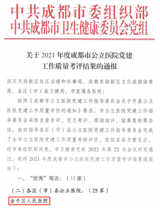 日前,市委组织部、市卫健委印发了《关于2021年度成都市公立医院党建工作质量考评结果的通报》,成都市85家公立医院受到通报表扬,我院获评区县级公立医院“优秀”等次。
